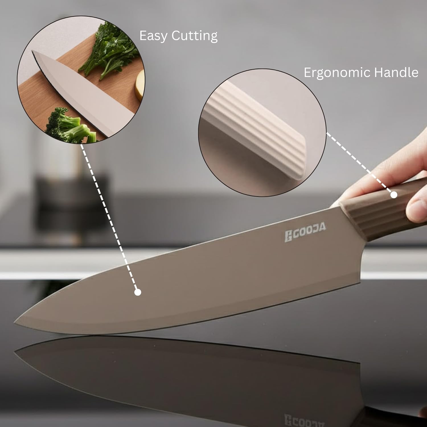 𝗘𝗥𝗚𝗢𝗡𝗢𝗠𝗜𝗖 & 𝗡𝗢𝗡-𝗦𝗟𝗜𝗣 𝗛𝗔𝗡𝗗𝗟𝗘𝗦 – Comfortable handles ensure a firm grip, improved control and reduced hand fatigue, making the knife set suitable for beginners, home cooks and professional chefs.