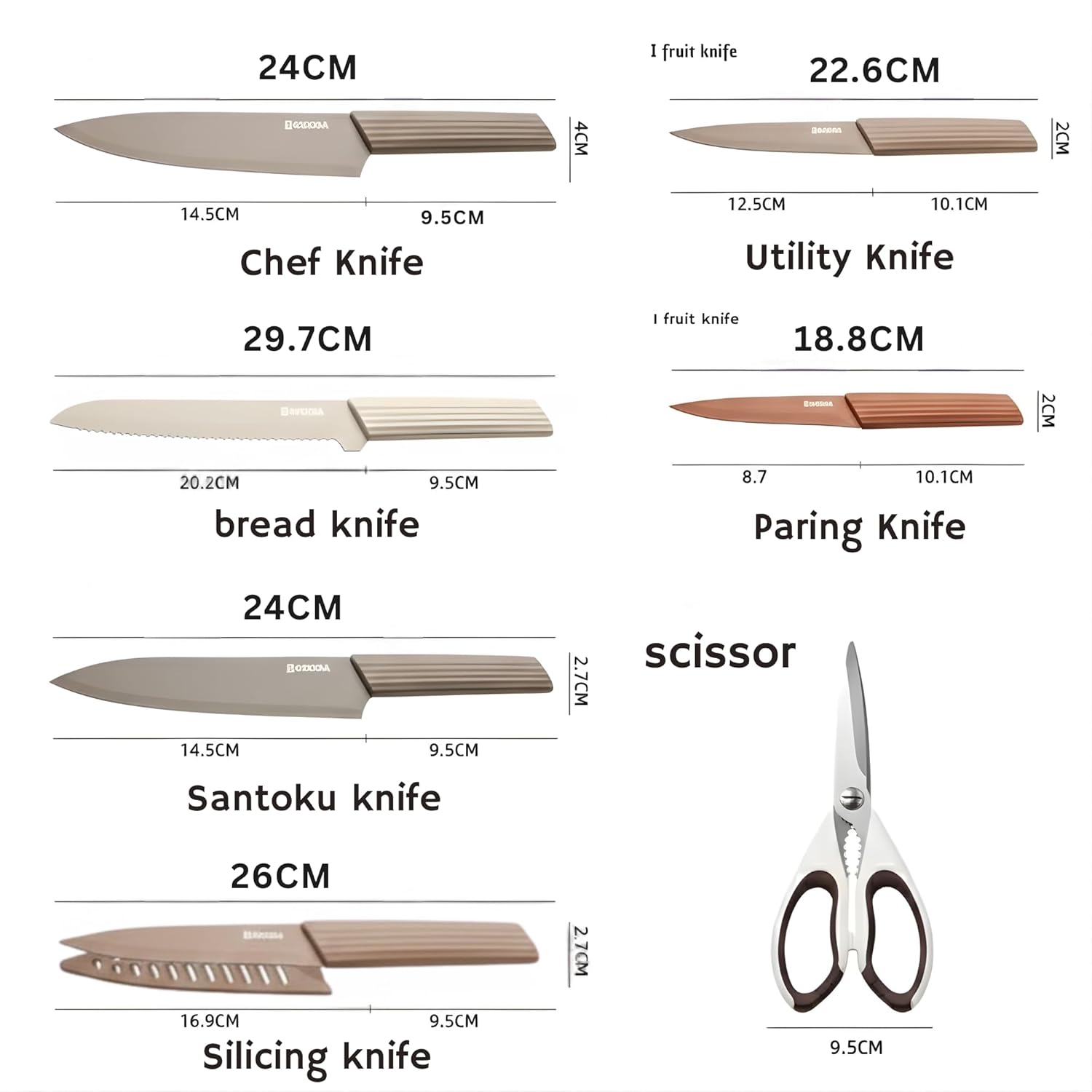 13-Piece Kitchen Knife Set | 6 Ceramic Coated Knives with 6 Blade Guards & Kitchen Scissors with Safety Cover | Chef, Santoku, Bread, Utility & Paring Knives | for Home & Restaurant Use | Multicolor