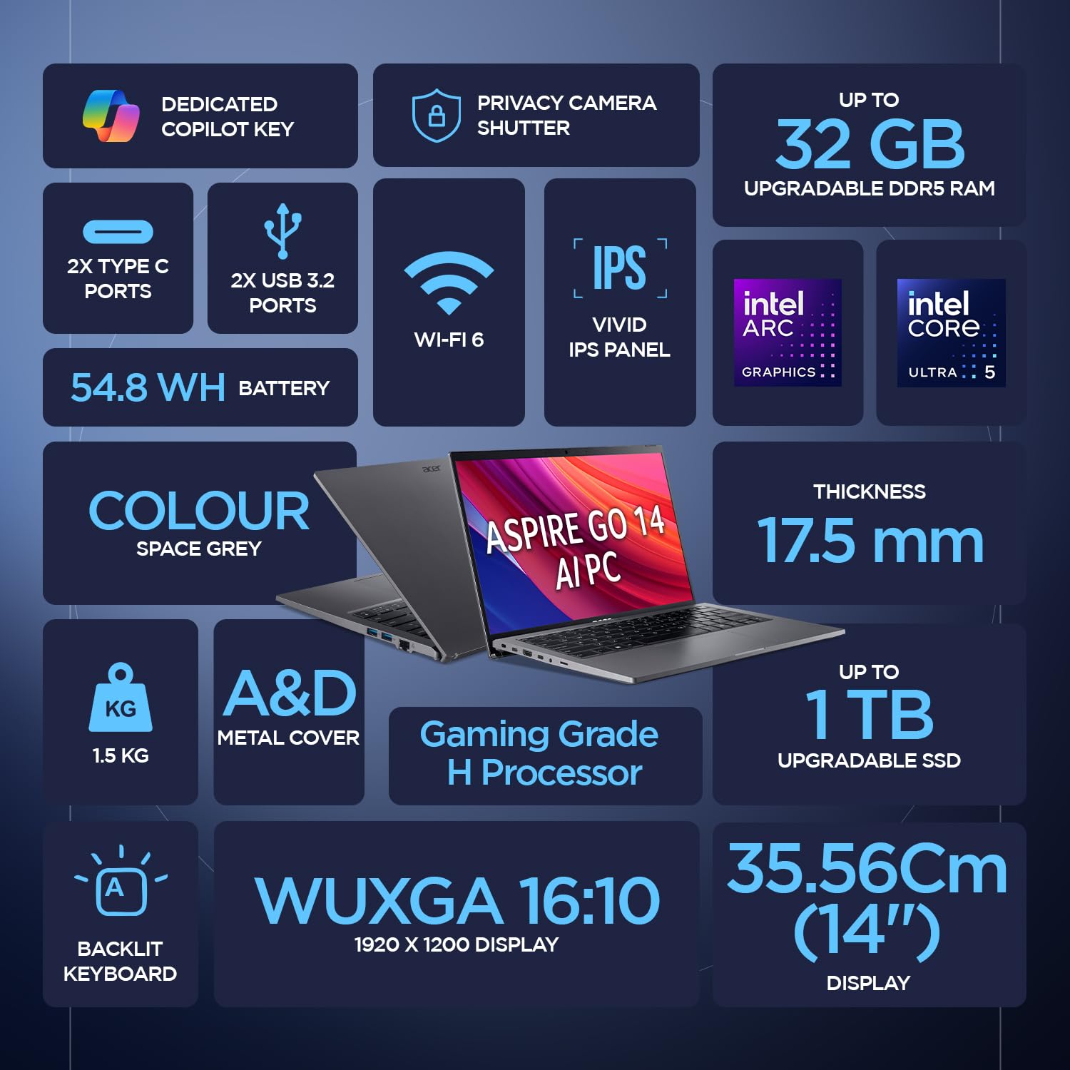 Processor :Intel Core Ultra 5 125H processor (3.6 GHz GHz base clock, up to 4.5 GHz max boost clock, 18 MB L3 cache, 14 cores) | Memory: 16 GB of DDR5 system memory, Upgradable to 32 GB using two soDIMM modules | Storage: 1TB, PCIe Gen3, 8 Gb/s up to 4 lanes, NVMe; upgradable up to 1TB with M.2