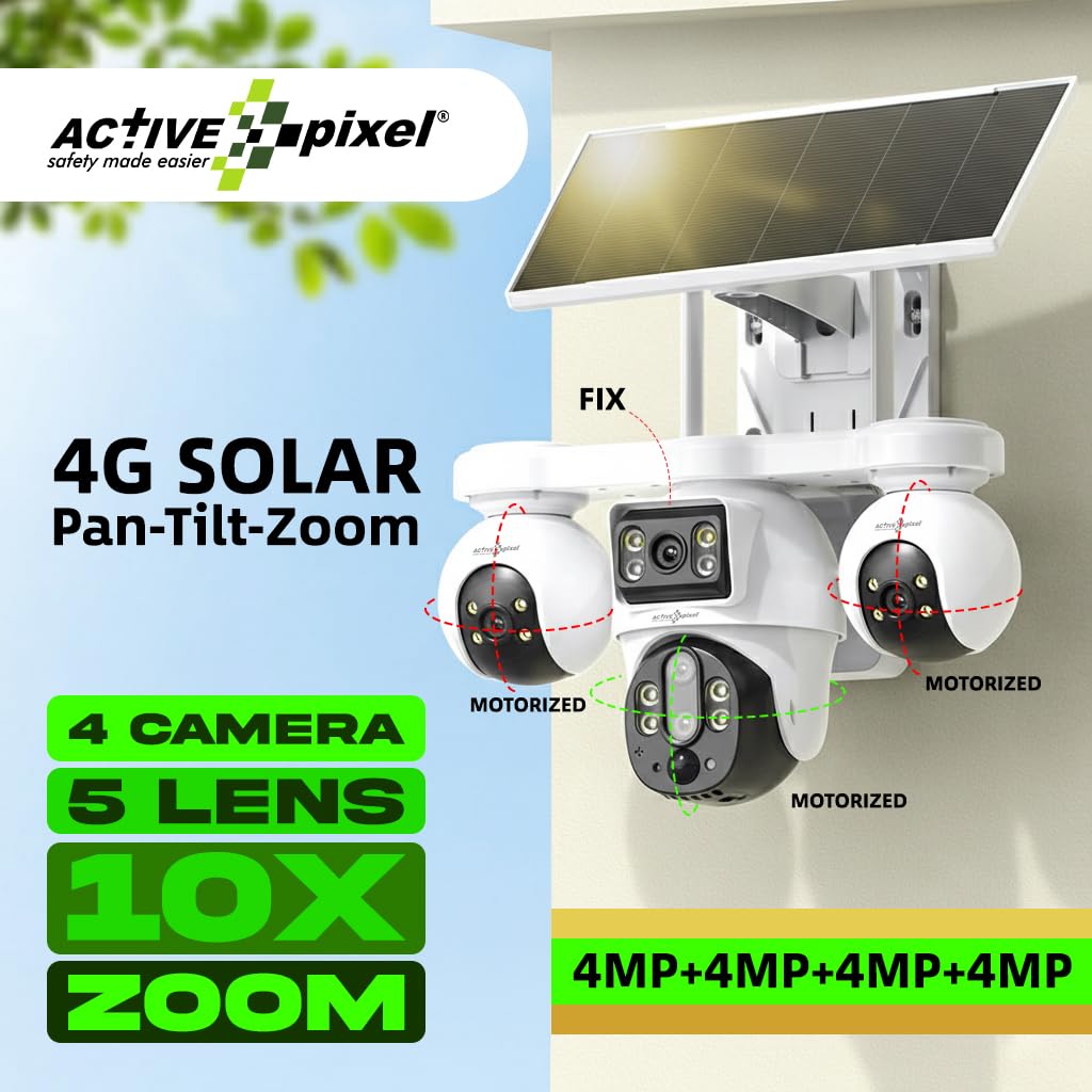 Active Pixel 4G 4MP Solar Security Camera Outdoor | 4 Camera Setup with 10X Zoom PTZ Main Lens 360° Pan Tilt | Dual Screen View | SIM Supported No WiFi CCTV | Color Night Vision | AI Motion Detection