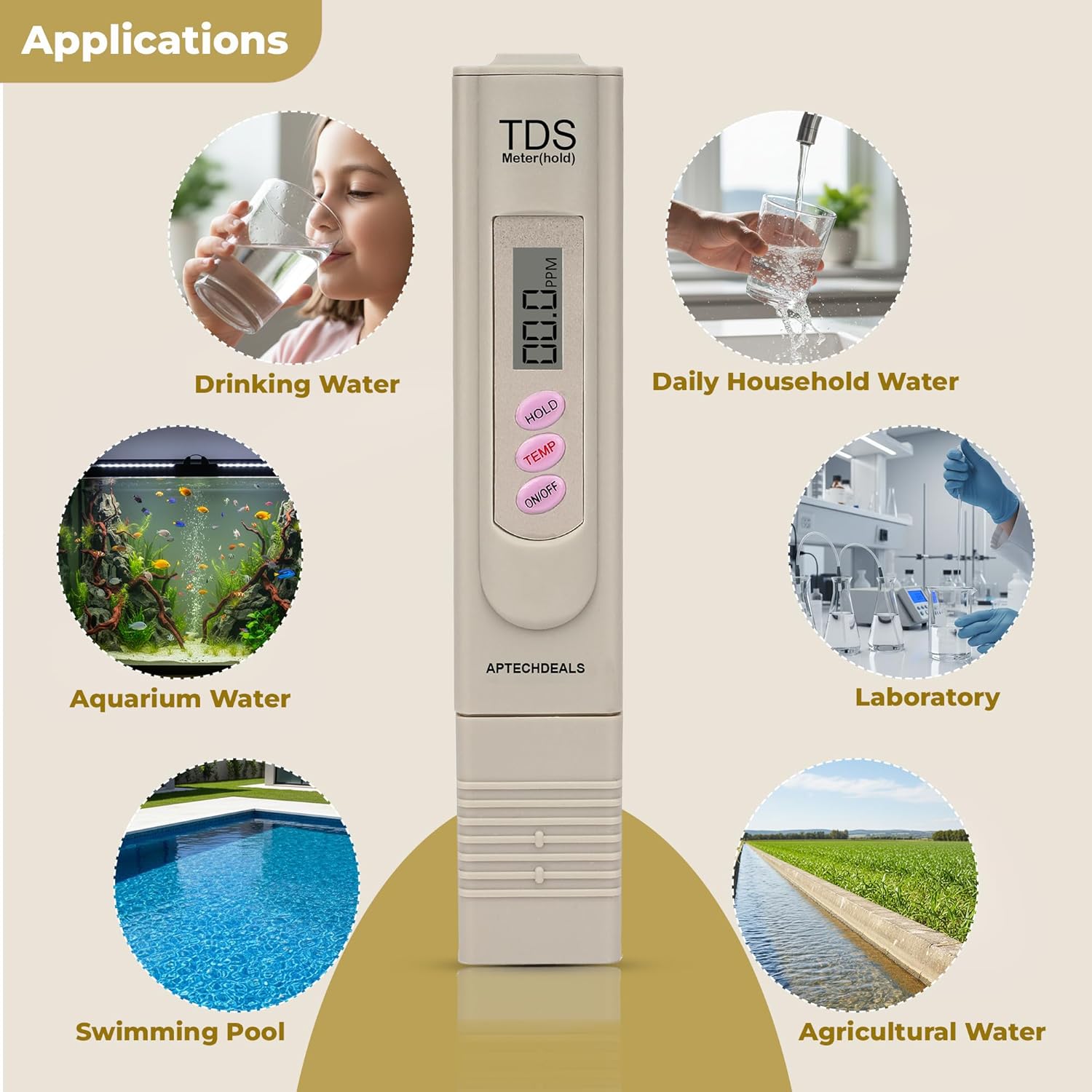 Accurate Water Quality Testing: Quickly measures Total Dissolved Solids (TDS) to check water purity and filtration performance.