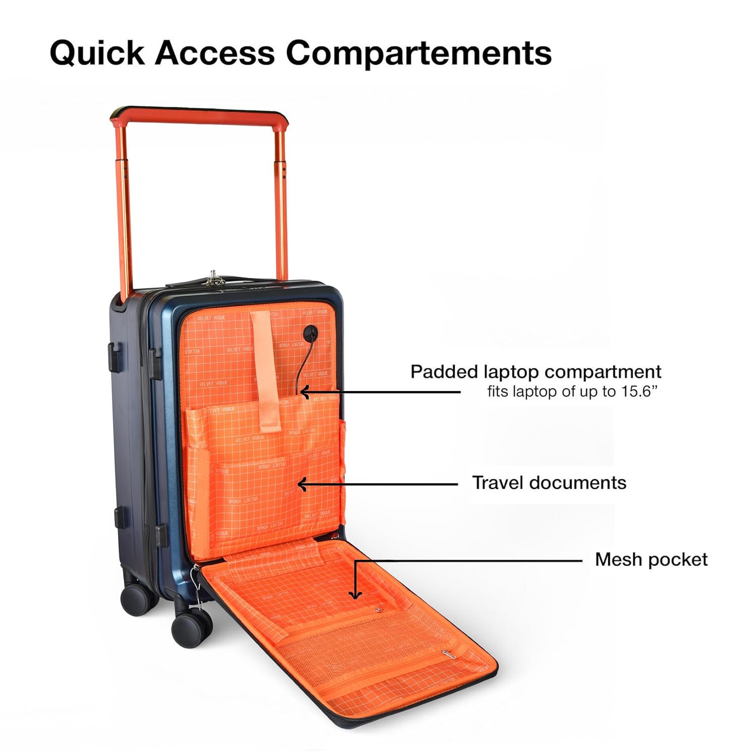 Smart Front Laptop Compartment for Quick Access: Travel smarter with a quick-access front compartment for a 15.6″ laptop, tablet, documents, and accessories. Padded for protection and easy to access during security checks, it keeps essentials organized without opening the main luggage—perfect for professionals on the go.
