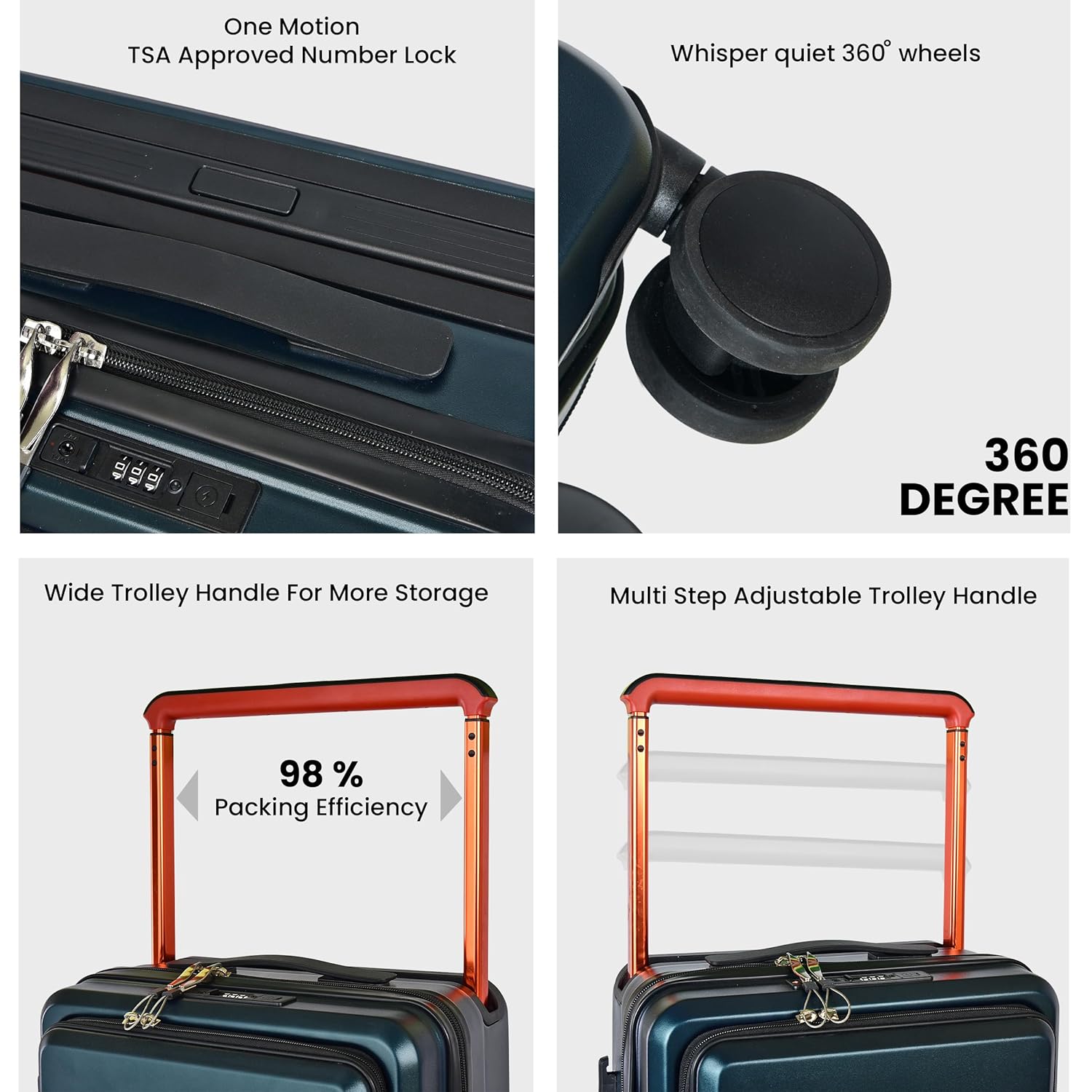 8 Silent Multi-Directional Spinner Wheels:Enjoy effortless mobility with 8 silent, multi-directional spinner wheels that glide smoothly across airports, stations, and city streets. Designed for easy handling, this trolley bag reduces strain on your arms and shoulders, ensuring a comfortable travel experience.