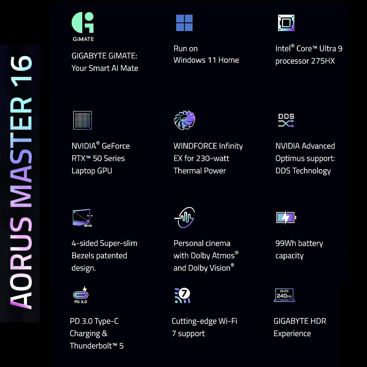 GIGABYTE AORUS Master 16 BZHC6INE64SH, Intel® Core™ Ultra 9 275HX, RTX™ 5090, 16″ OLED QHD 240Hz, DDR5 5600 16GB*2, Gen4 1TB, Gaming Laptop (Black/ 2.5 kg), Win 11Home