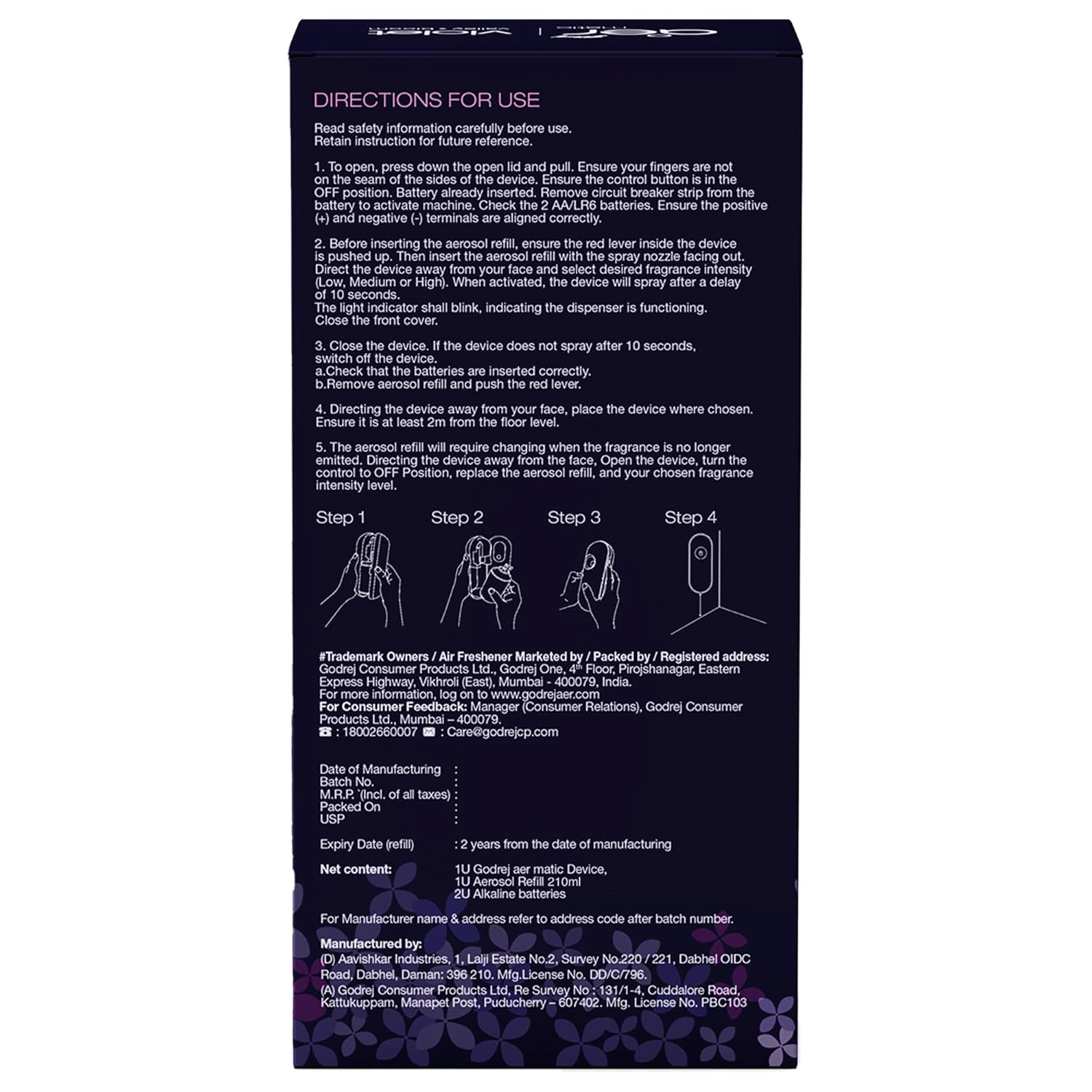 Contains: 1 unit of Godrej aer Matic Room fresheners automatic machine + Room freshener refill (210ml). Variant: Lavender Bloom