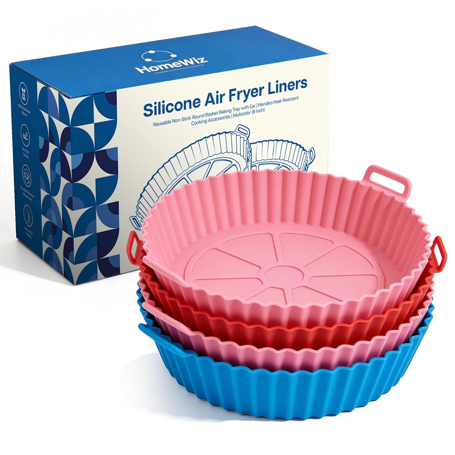 HomeWiz Silicone Air Fryer Liners | Reusable Non-Stick Round Basket Baking Tray with Ear Handles | Heat-Resistant Cooking Accessories | Multicolor (8 Inch, Pack of 4)