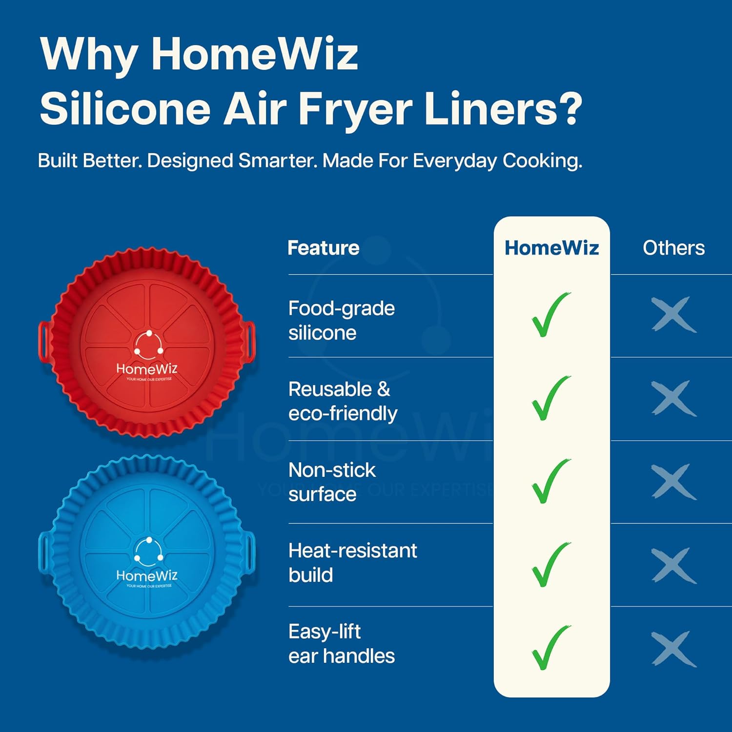 PREMIUM FOOD-GRADE SILICONE | SAFE & BPA-FREE: Made from high-grade, food-safe silicone, HomeWiz air fryer liners are non-toxic, BPA-free and odourless, ensuring safe and healthy cooking for you and your family.