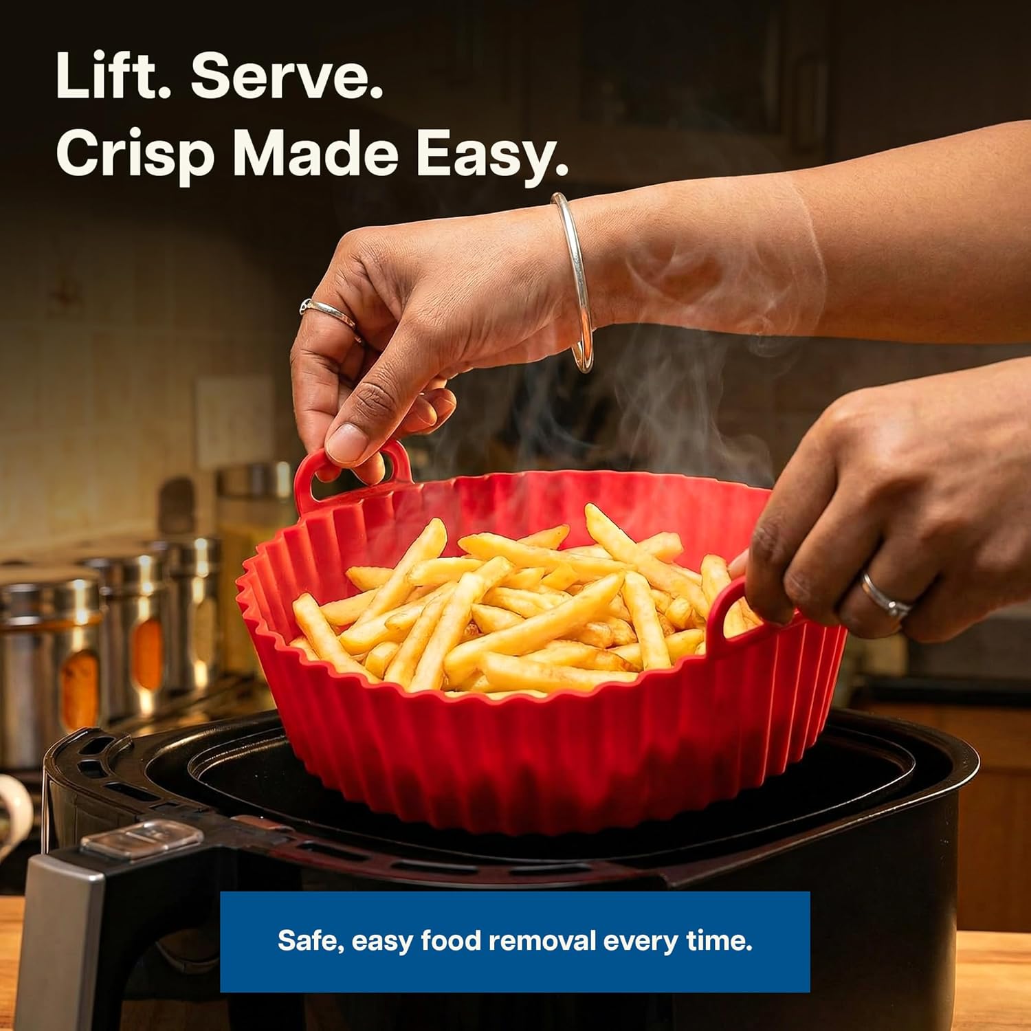 Upgrade your air frying experience with HomeWiz Air Fryer Silicone Liners, designed for cleaner cooking, better airflow and effortless maintenance. Crafted from premium food-grade BPA-free silicone, these liners are built to handle high temperatures while remaining safe and durable. The non-stick surface and raised base design allow oil and grease to drain away from food, helping you enjoy healthier, crispier results every time. The 360° air circulation structure ensures even heat distribution, while the 1.5x raised edges protect your air fryer basket from grease buildup. Reusable and dishwasher safe, these liners eliminate the need for disposable paper liners and messy cleanups. With easy-lift handles and a universal 8-inch fit, HomeWiz air fryer liners are a must-have accessory for every modern kitchen.