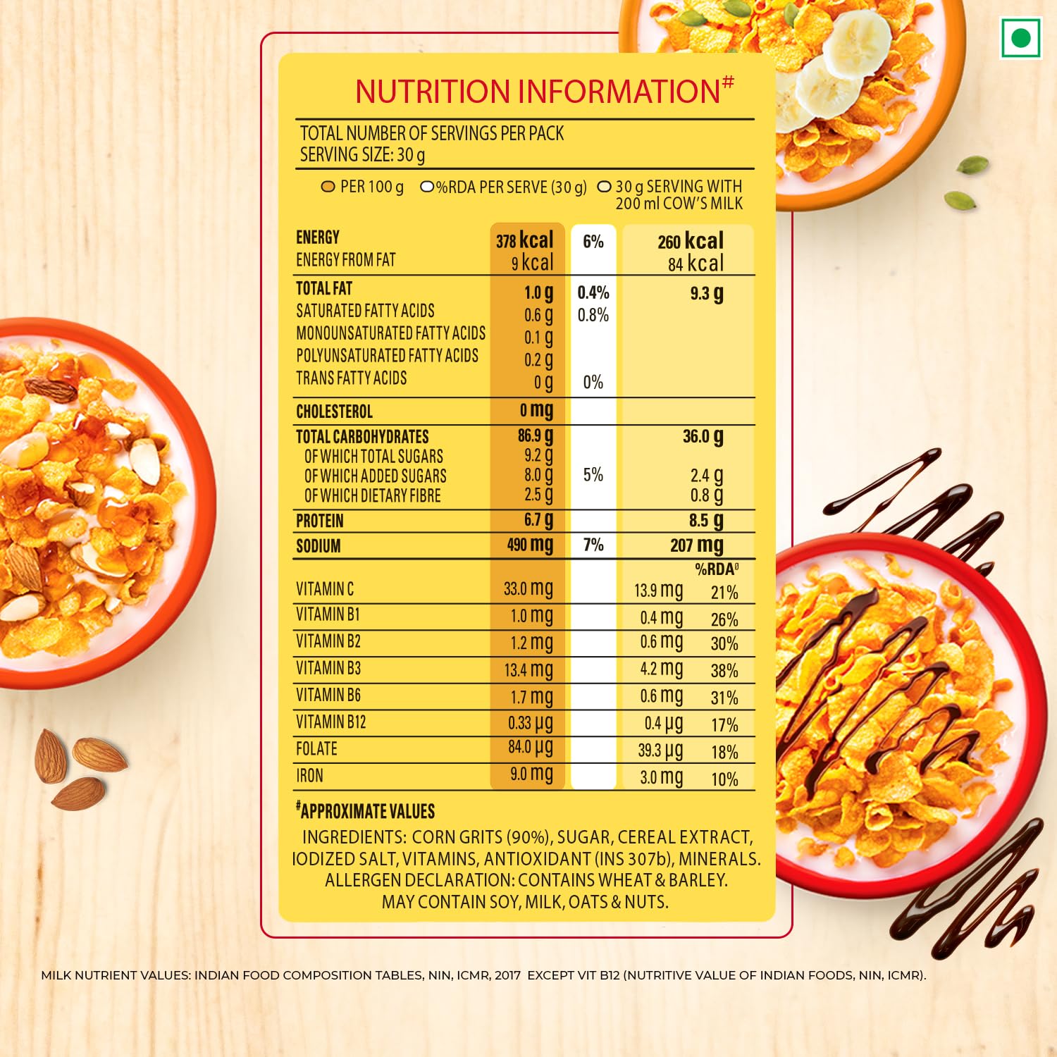 Kellogg’s Corn Flakes is a nourishing and tasty ready-to-eat breakfast cereal which is High in Iron, Vitamin C and key essential B group Vitamins such as B1, B2, B3, B6, B12 and Folate.