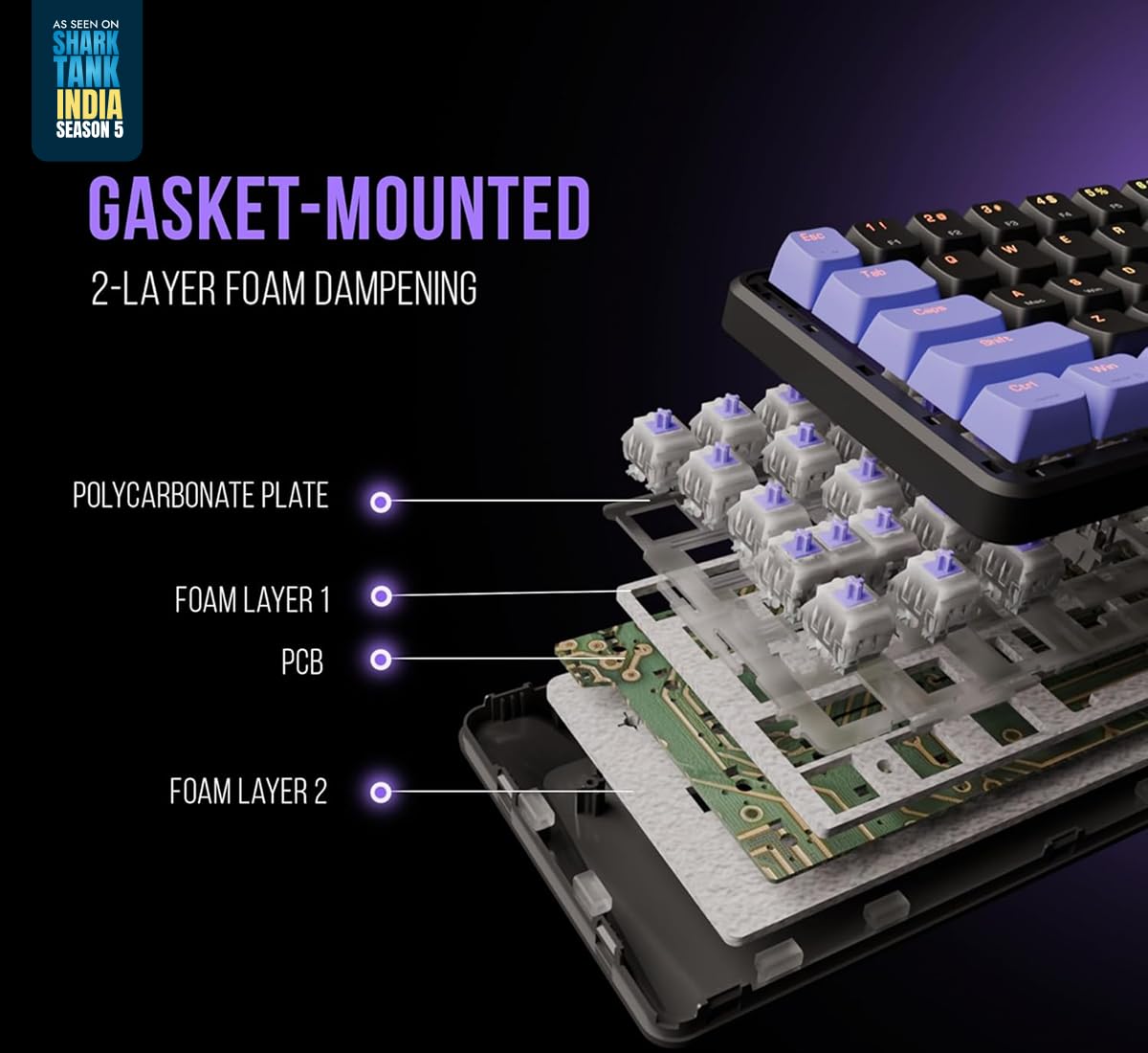 The gasket-mounted structure minimizes vibrations for a quieter, cushioned typing experience and improved acoustics, helping reduce fatigue during long use.