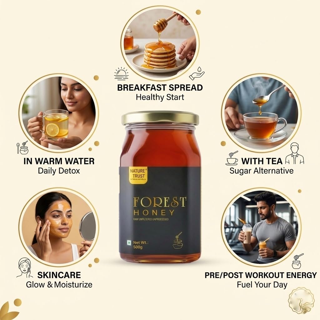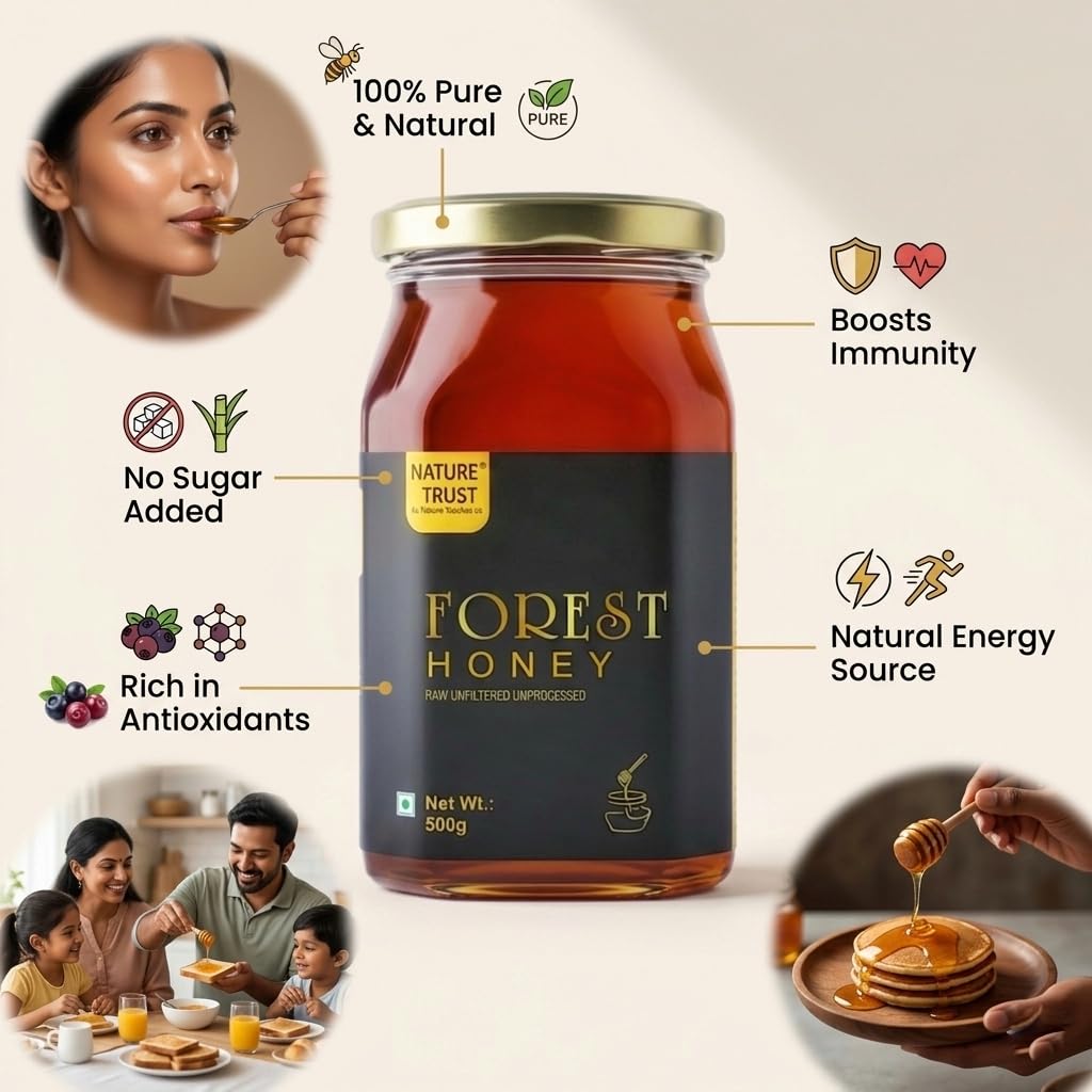 It’s a raw, unfiltered, unprocessed and unpasteurized 100% Pure & Natural honey direct from farms. No added preservatives, No added artificial colours and No added sugarsOur Raw Honey, which is naturally sourced from the forest, is high on amino acids, natural enzymes, vitamins, minerals, bee pollens, probiotics and antioxidants. That makes it a boon for mankind.Taste the lip-smacking sweet nectar extracted from Multi-Flora via the conventional ‘drop by drop’ process without losing its authenticity, luscious taste and rich medicinal valuesNatural Honey is great replacement for Sugar as natural sweetener in tea, coffee and breakfast cereals etc.