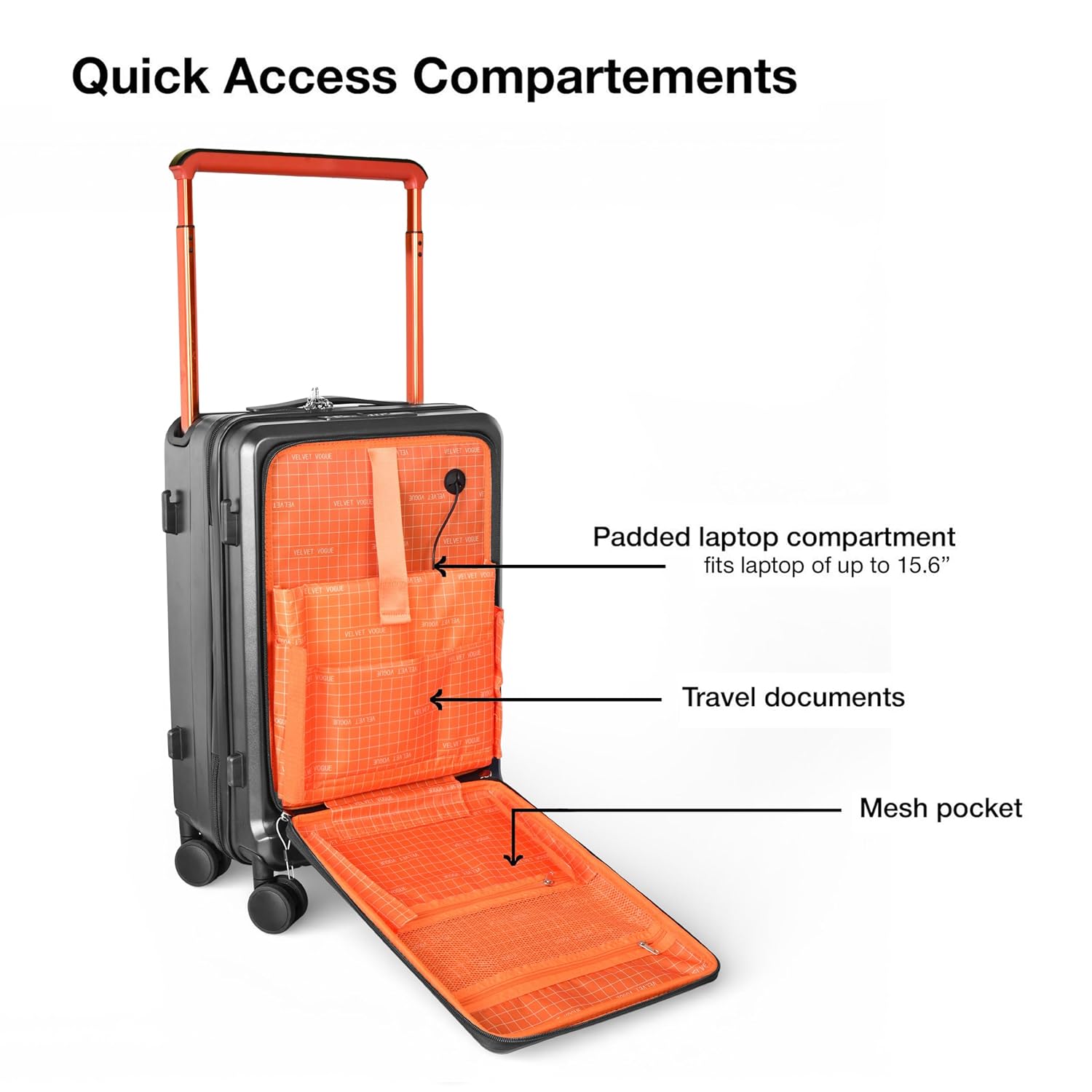 Smart Front Laptop Compartment for Quick Access: Travel smarter with a quick-access front compartment for a 15.6″ laptop, tablet, documents, and accessories. Padded for protection and easy to access during security checks, it keeps essentials organized without opening the main luggage—perfect for professionals on the go.