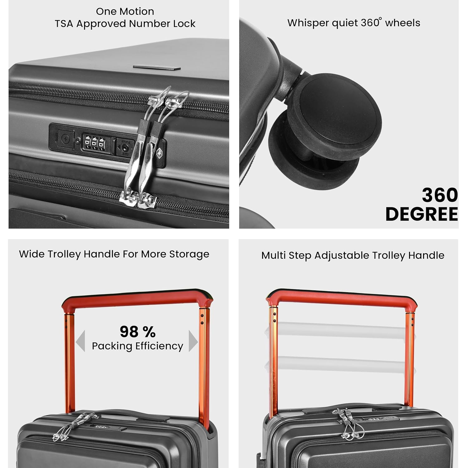 8 Silent Multi-Directional Spinner Wheels:Enjoy effortless mobility with 8 silent, multi-directional spinner wheels that glide smoothly across airports, stations, and city streets. Designed for easy handling, this trolley bag reduces strain on your arms and shoulders, ensuring a comfortable travel experience.