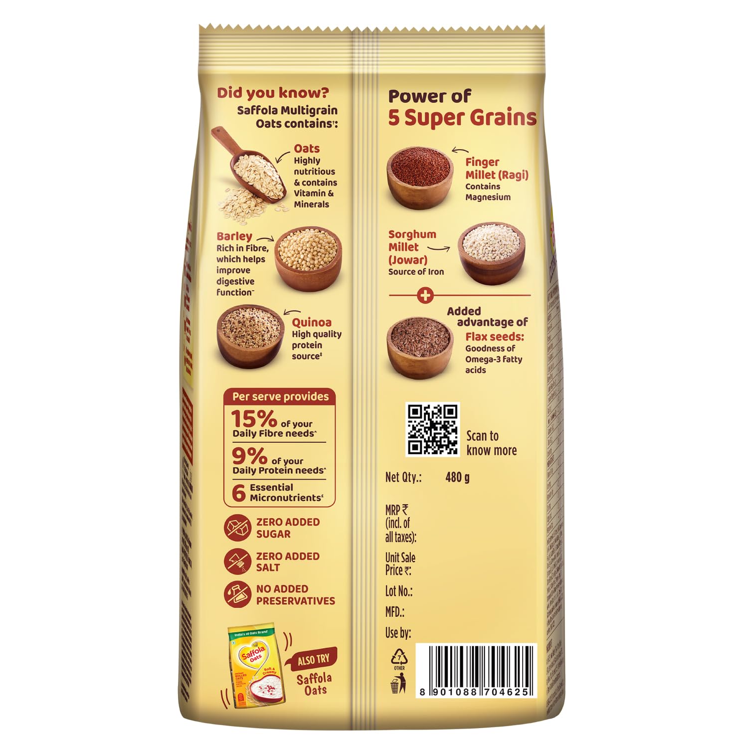 Saffola Oats Multigrain has goodness of 5 super grains + Flax seeds now in one bowl!! Made with 5 Super Grains + Flax seeds for sugar conscious diet, helps reduce cholesterol, aids weight management, helps reduce risk of high BP, aids digestion 5 Super Grains – Oats, Ragi, Quinoa, Jowar, Barley. Oats – Highly nutritious and contains vitamins and minerals Ragi – Contains Magnesium Quinoa – High quality protein source Jowar – Source of Iron Barley – Rich in Fibre, which helps improve digestive function It also has an added advantage of Flax seeds which has goodness of Omega 3- fatty acids It contains Zero Added Sugar, Zero Added Salt, No Added Preservatives