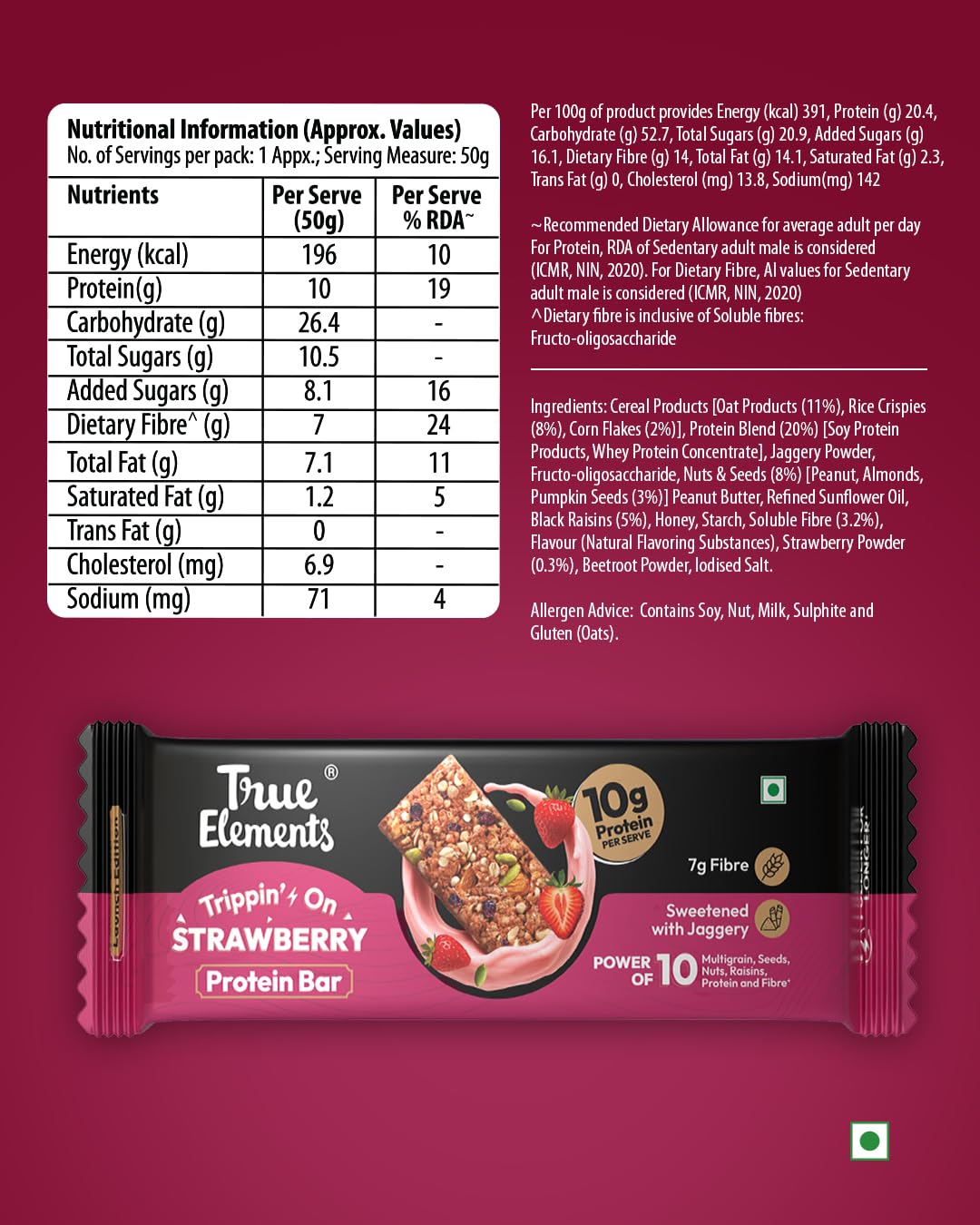 True Elements Trippin On Berry Protein Bar 300g (Pack of 6 * 50g) – 10g Protein + 7g Fibre | Crunchy Protein Bar with No Refined Sugar | Healthy Snacks